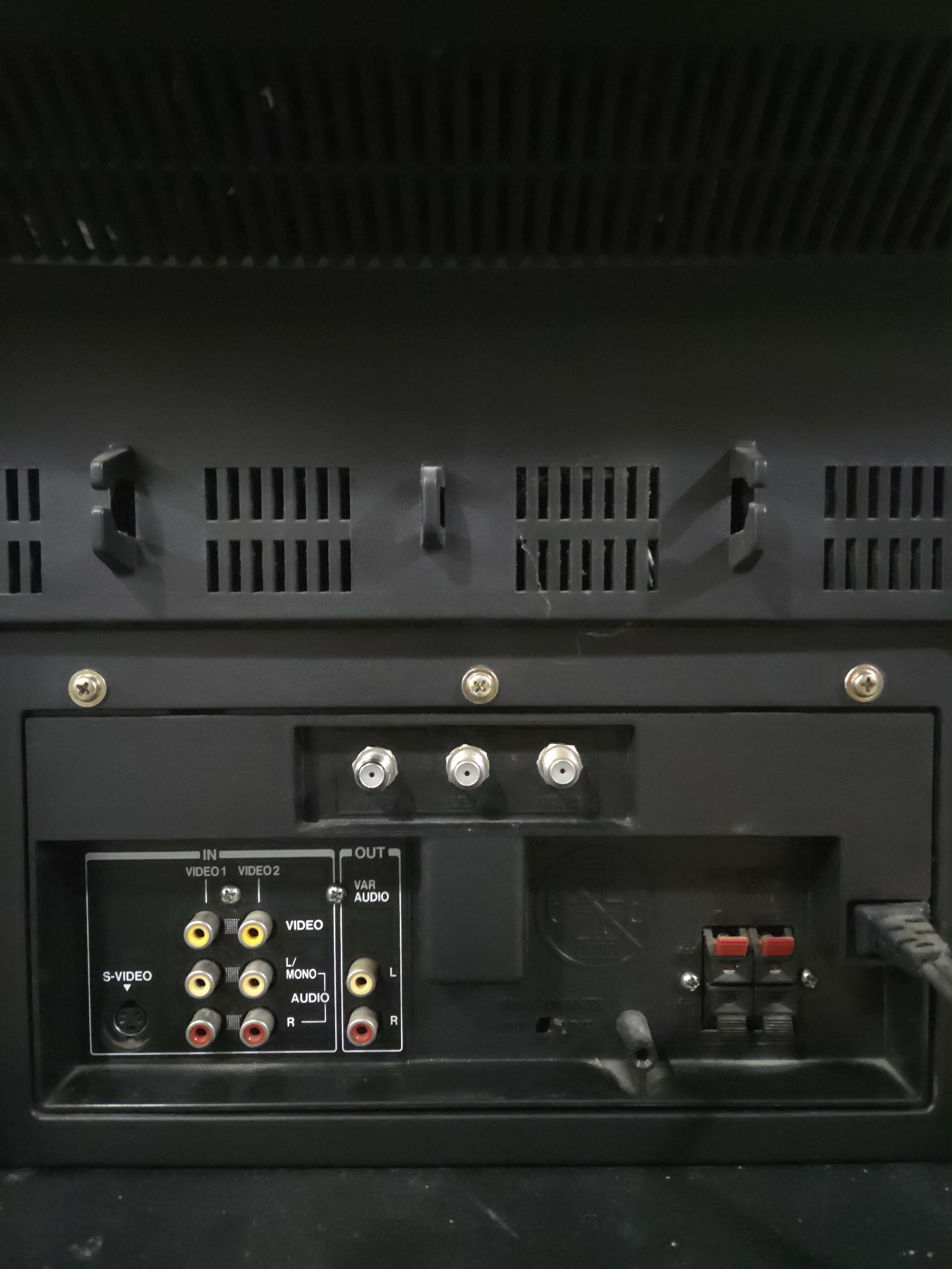 Higher-end 27" TV by Toshiba, part of their Cinema Series line, introduced in 1993. Has RF composite, and s-video inputs with bassy stereo sound blasting from the CYCLONE speaker system. Originally manufactured in the USA in 1994.