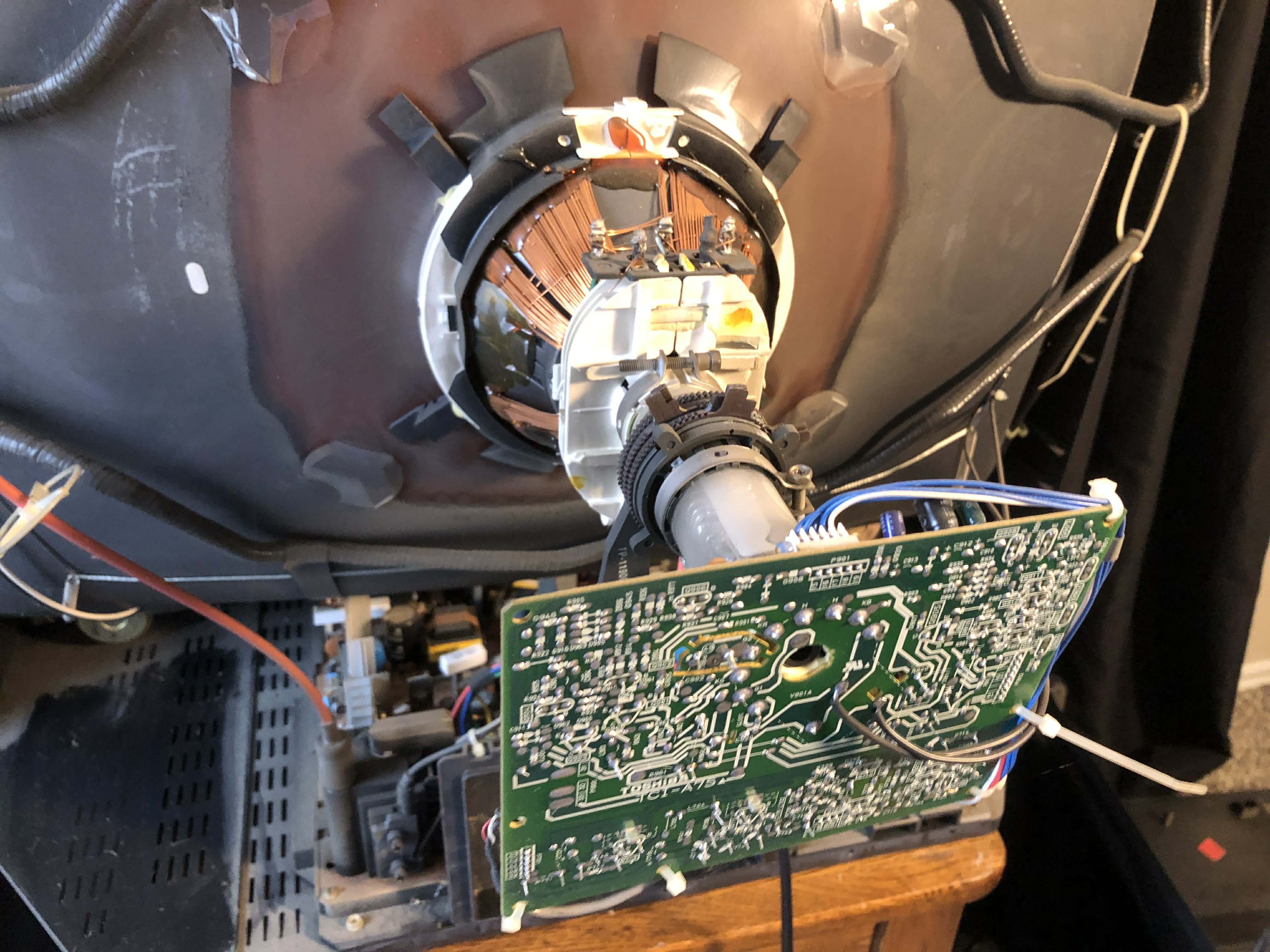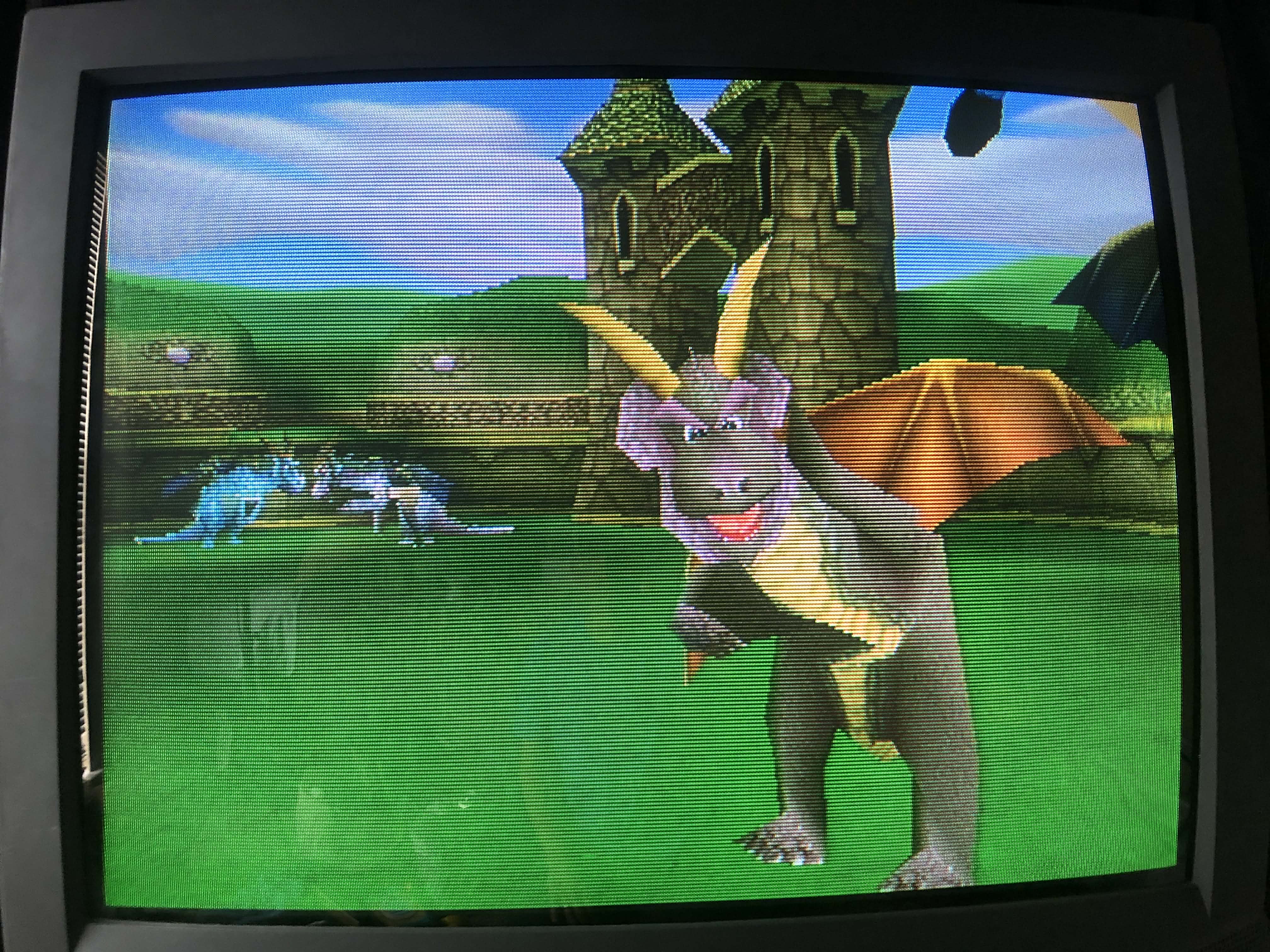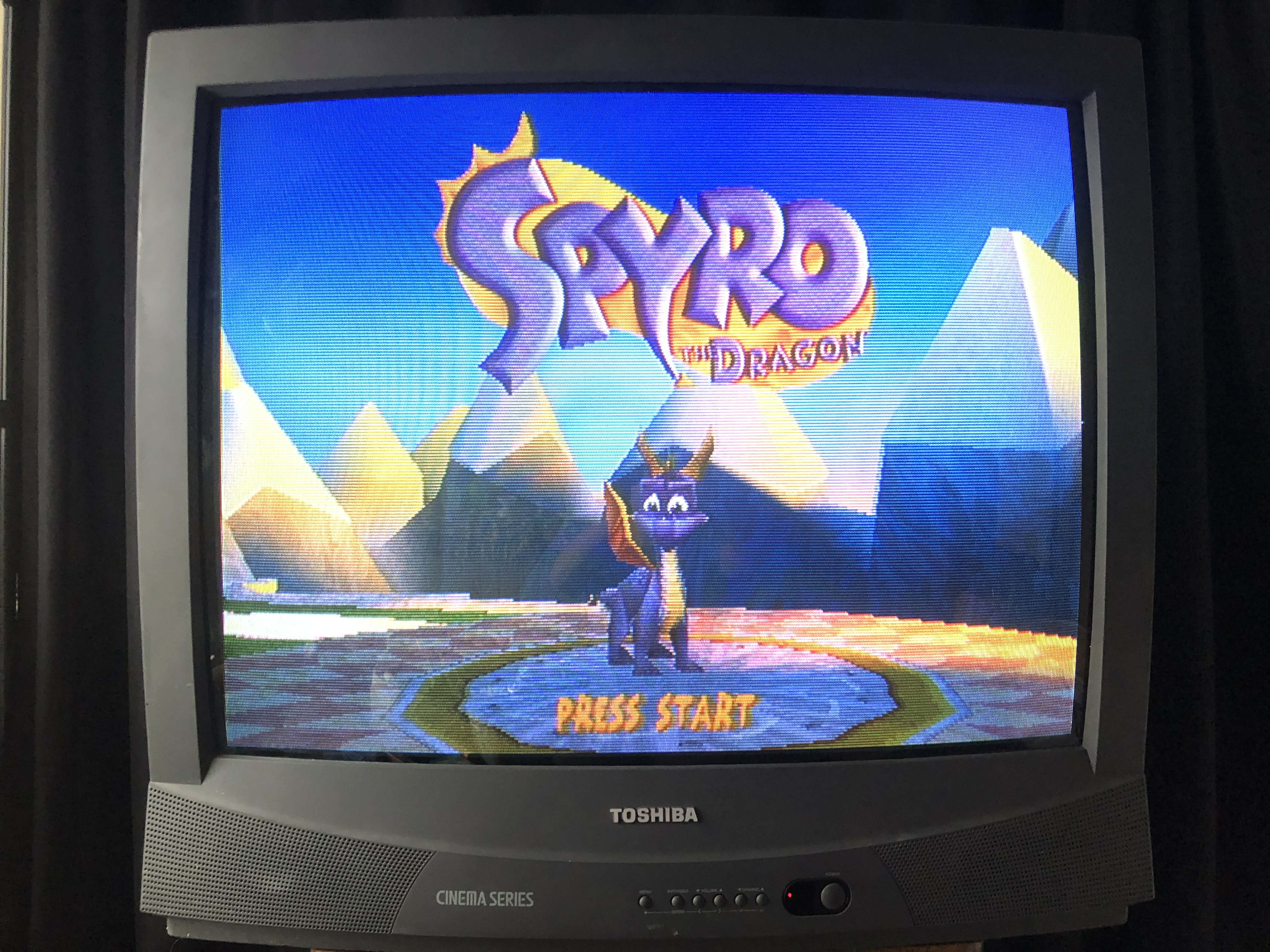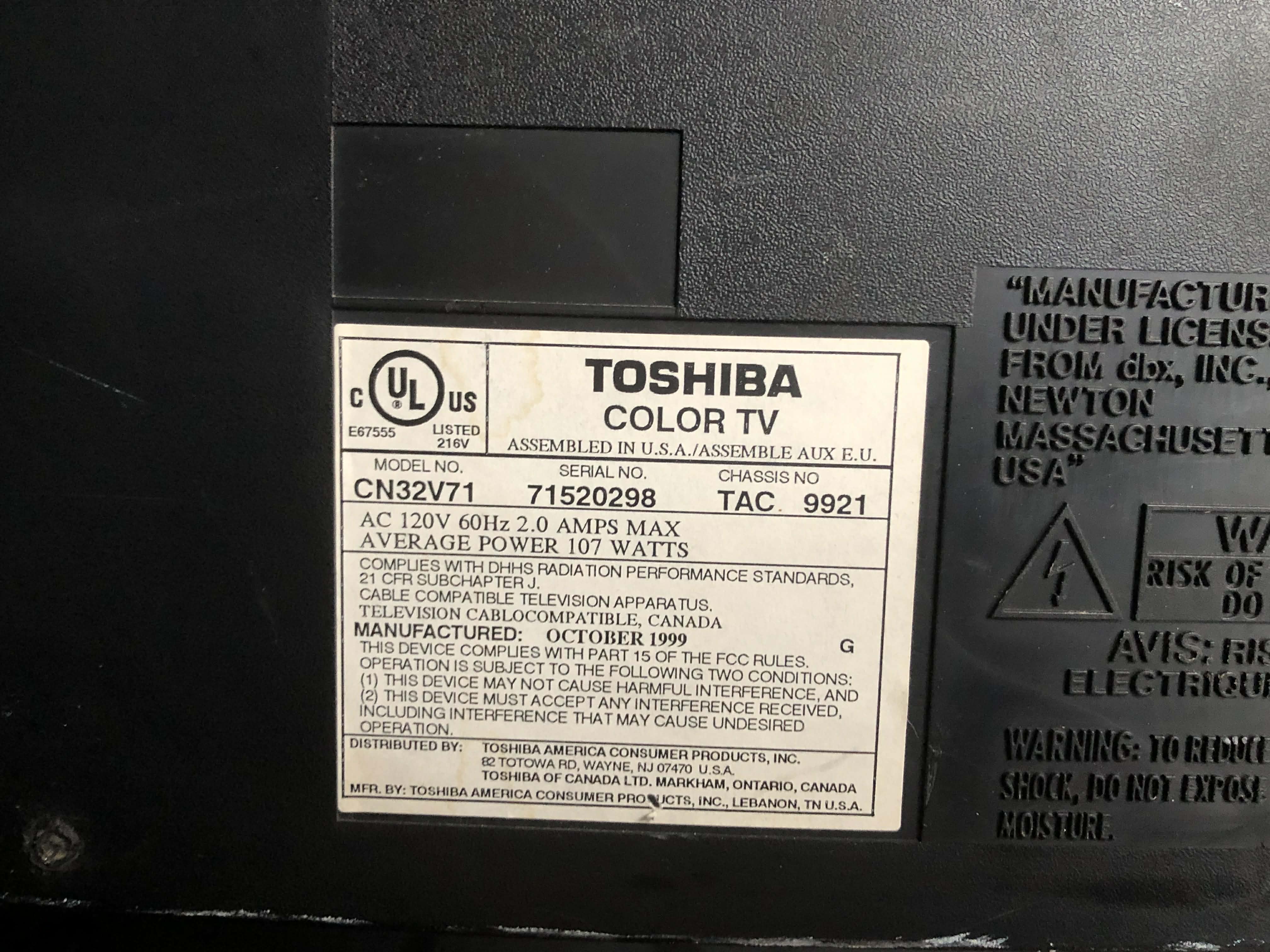 32" curbed-screen CRT by Toshiba, made in the USA in 1999. Has RF, composite, s-video, and component inputs with stereo sound.