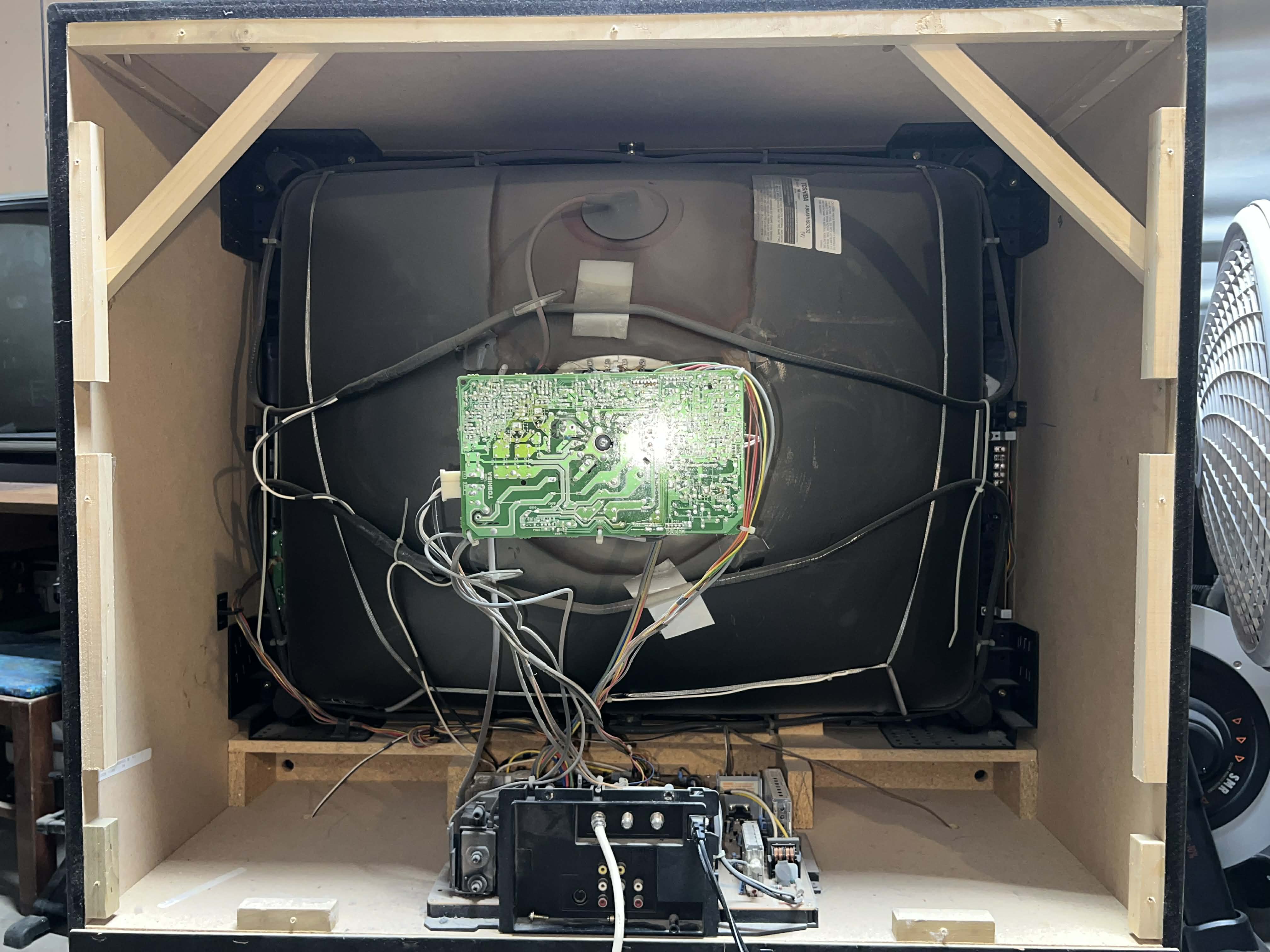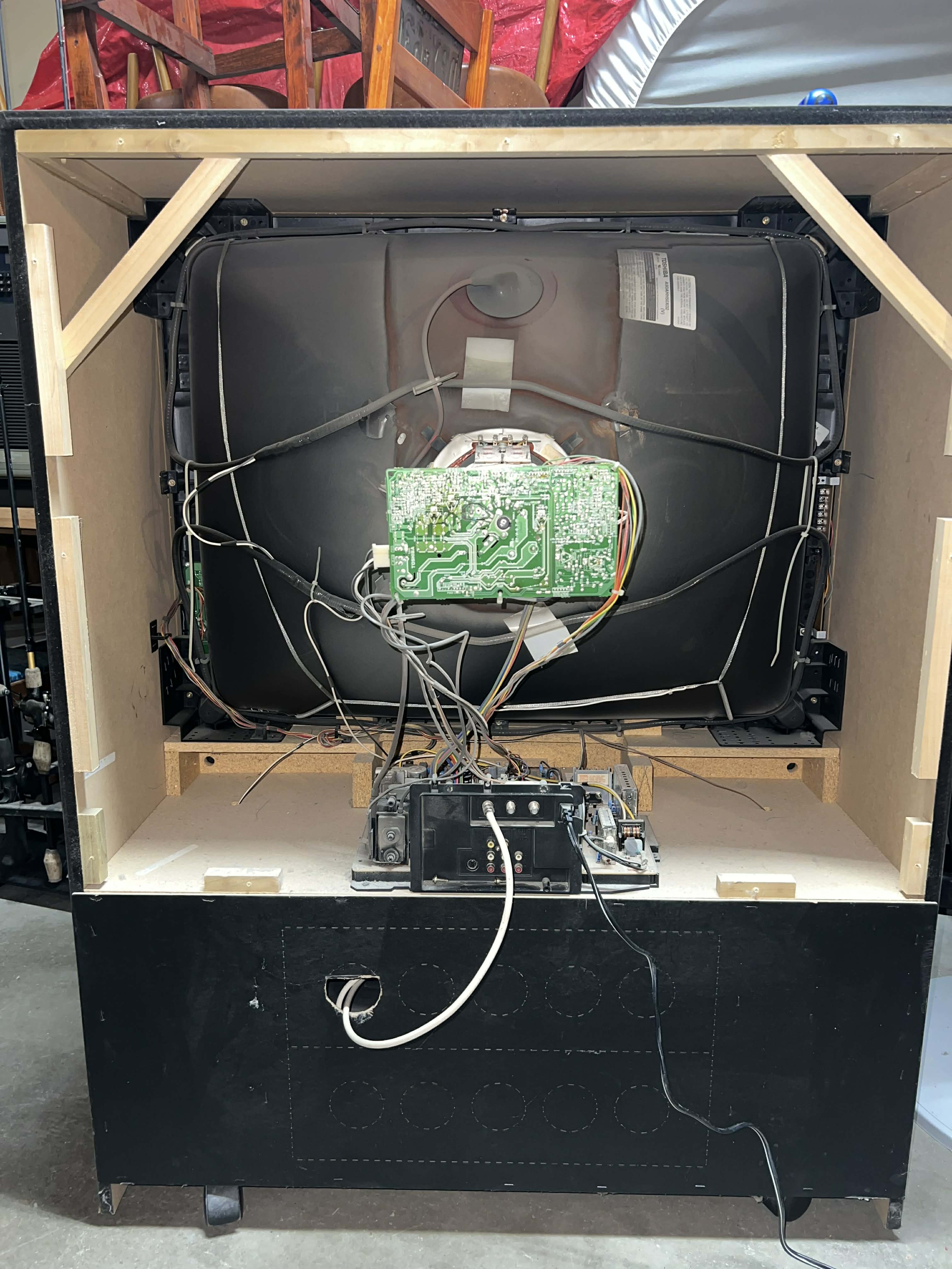 36" vertical wooden console TV by Toshiba, made in the USA in 1996. Has RF, composite, and s-video inputs with stereo sound.
