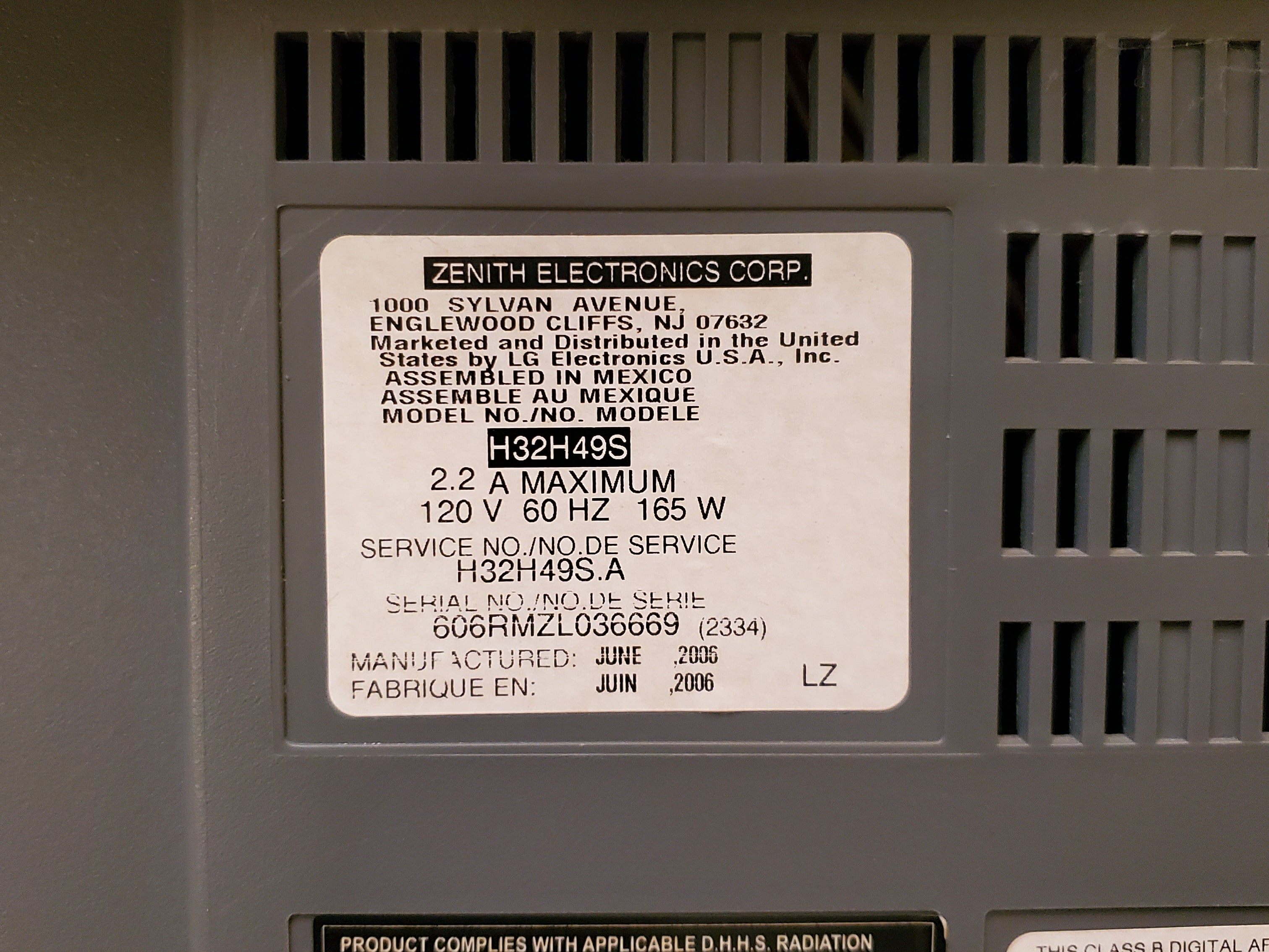 32" flat multimedia display by Zenith. Accepts 240p/480i over RF, composite, s-video, component inputs and 800x600 on the VGA input. Originally manufactured by LG in 2004.