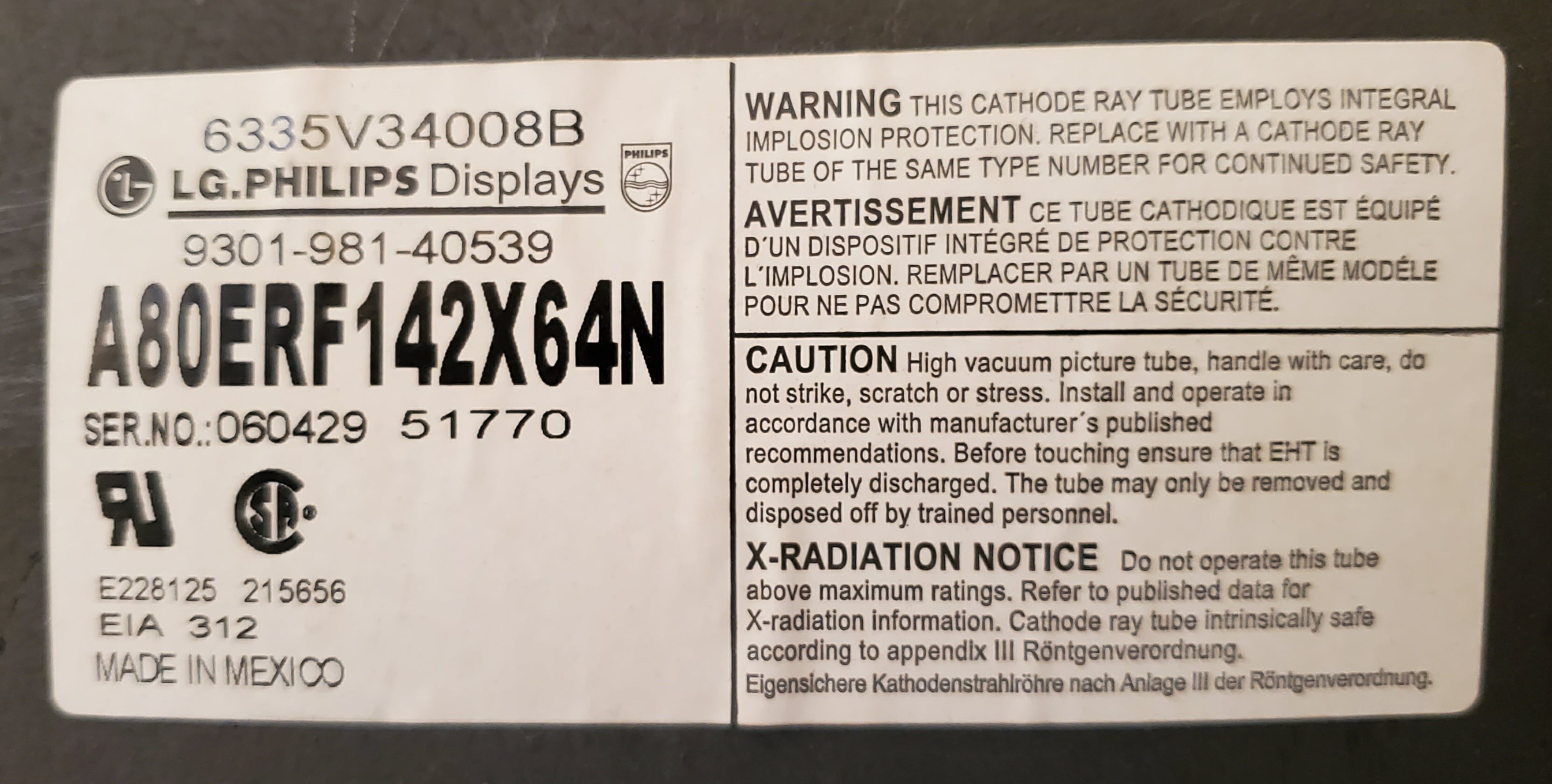 | Tube: | LG.Philips , A80ERF142X , A80ERF142X64 |