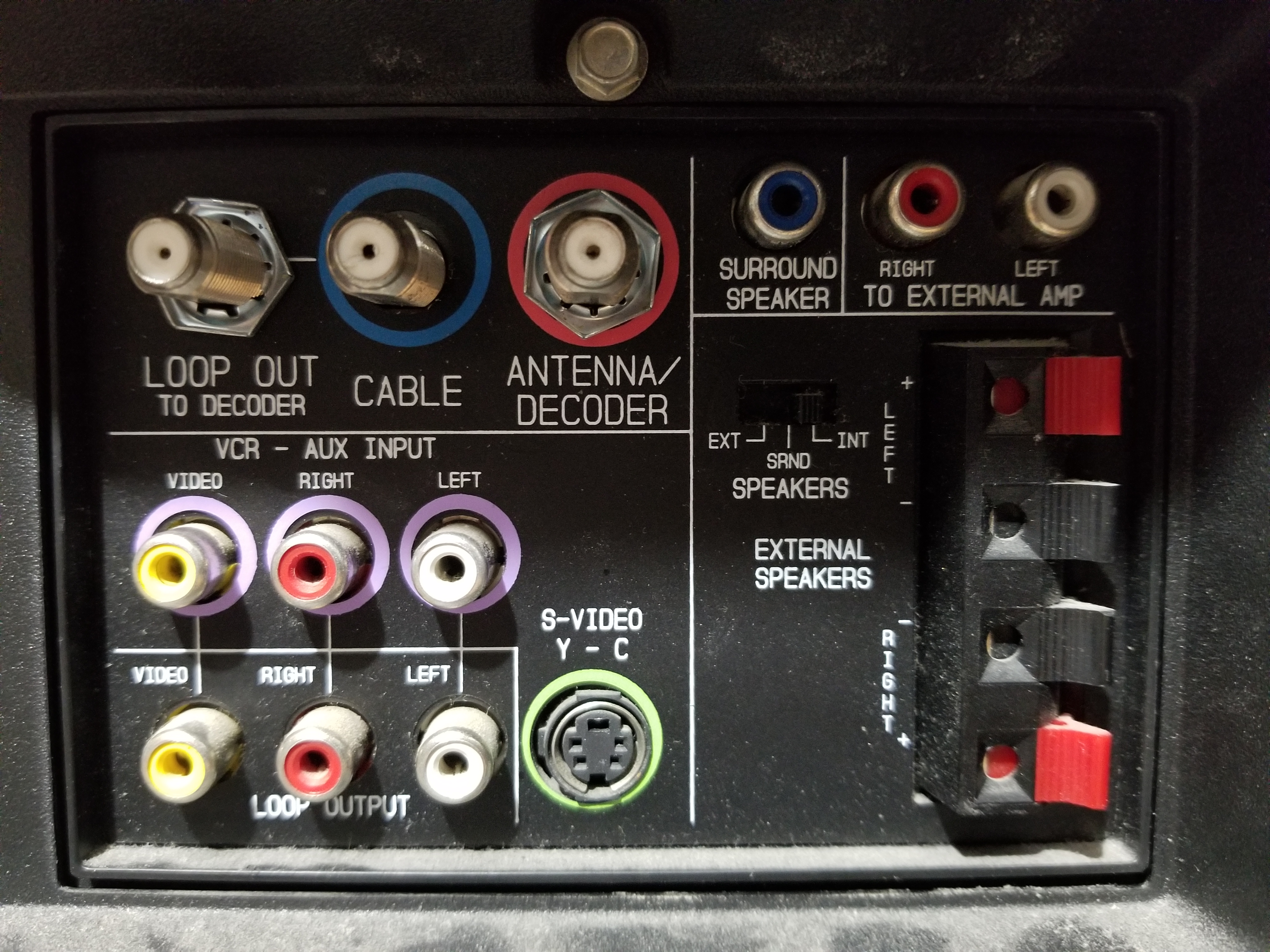 Higher end set with S-Video, powered speaker jacks, and an output for a surround speaker.