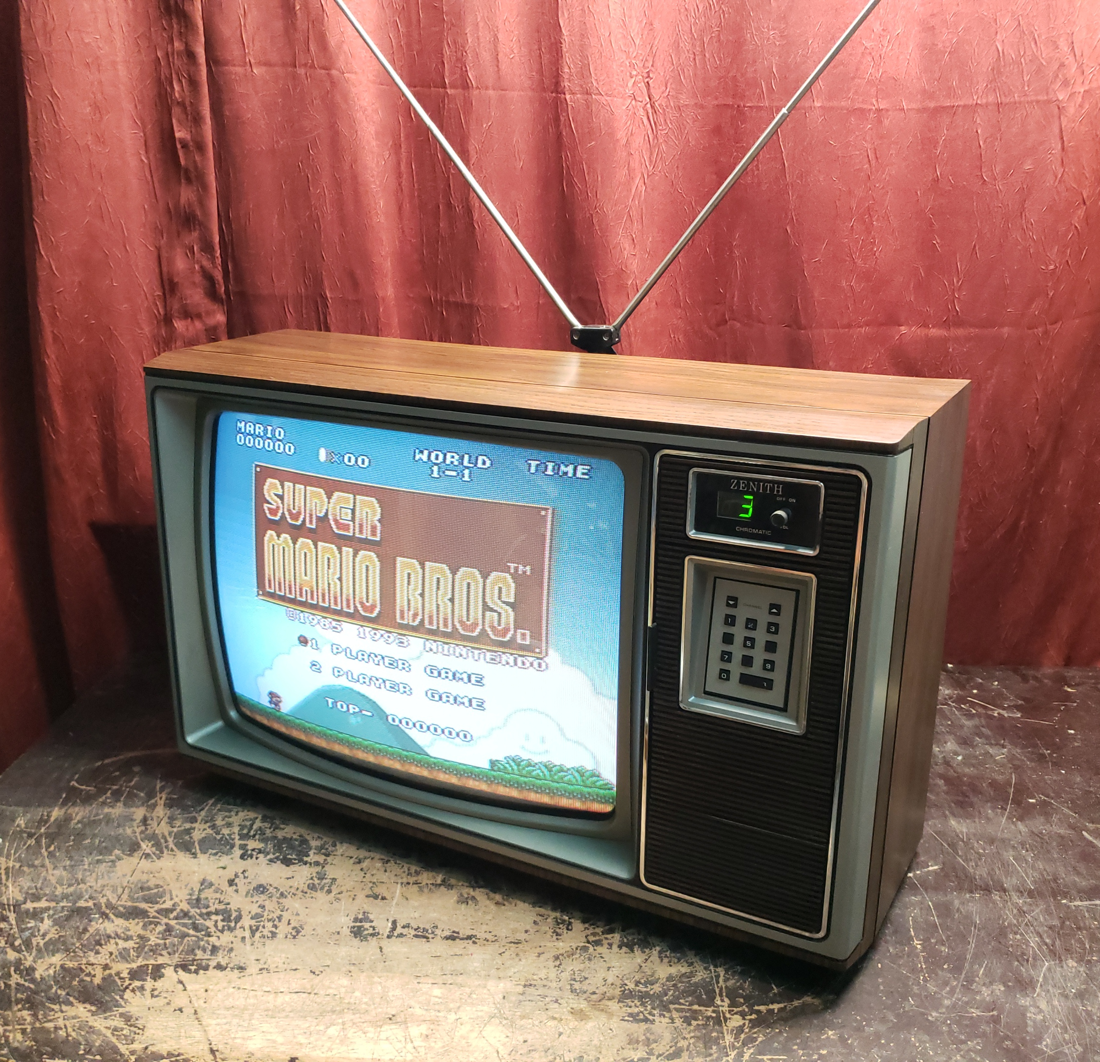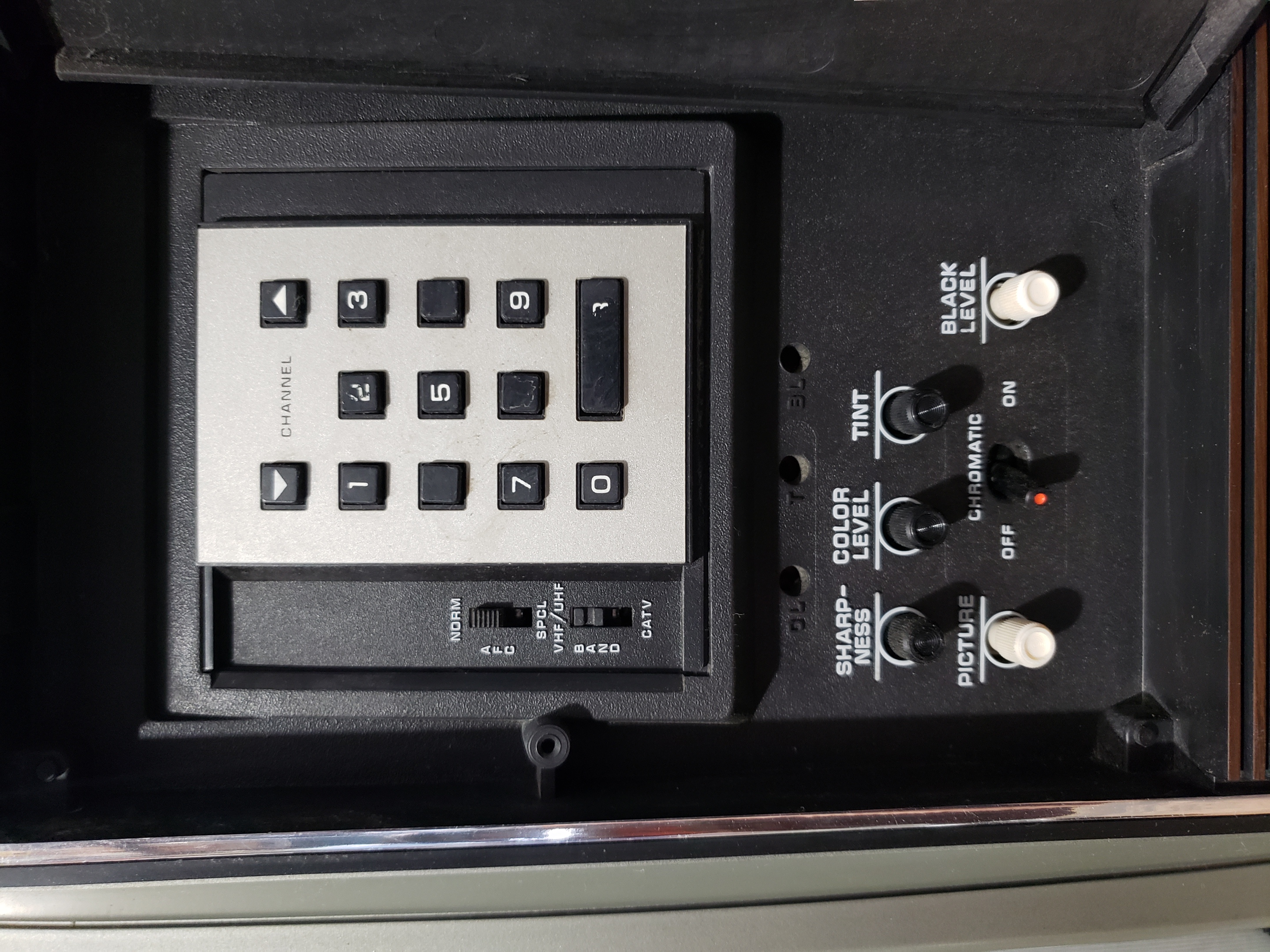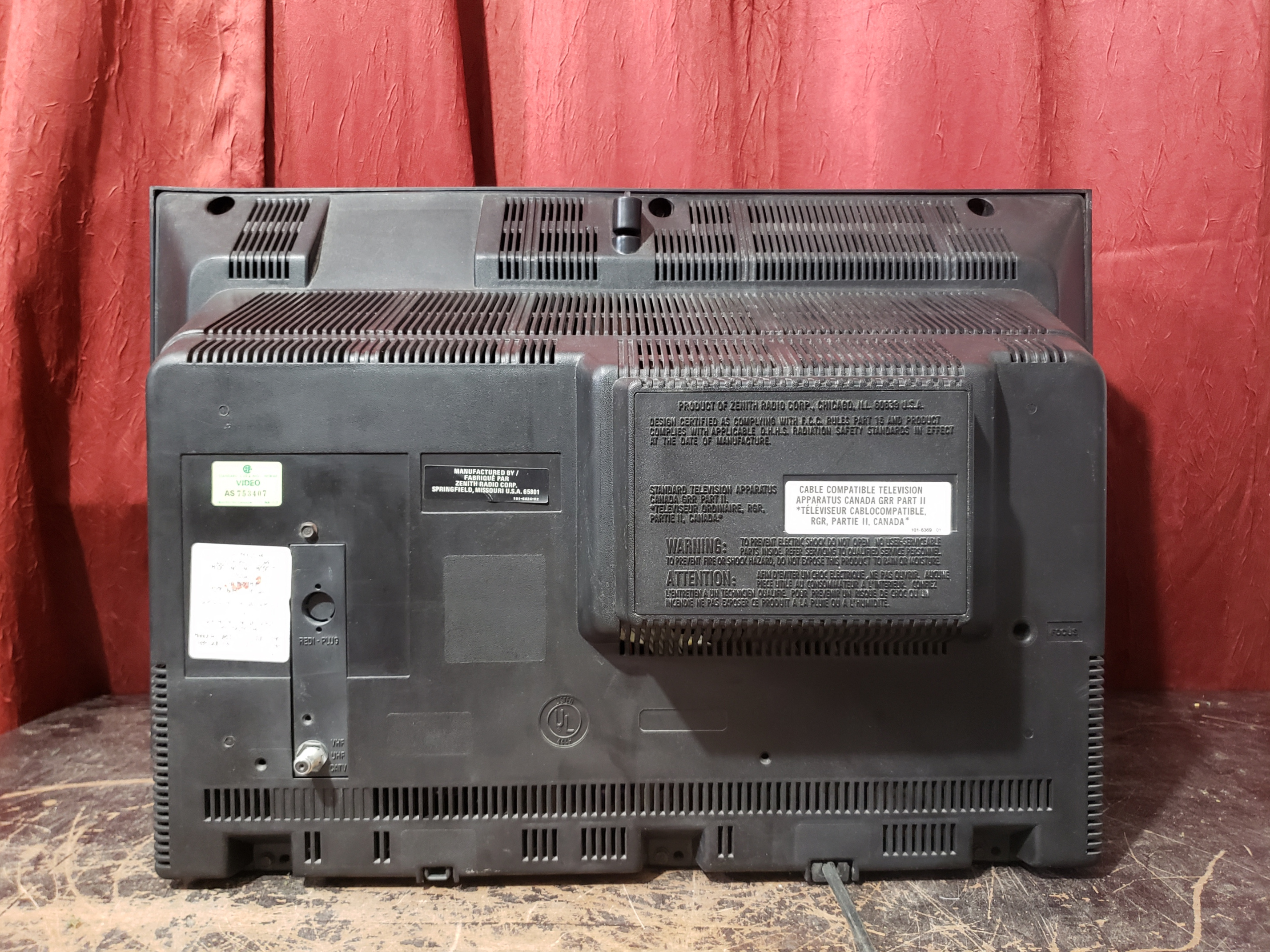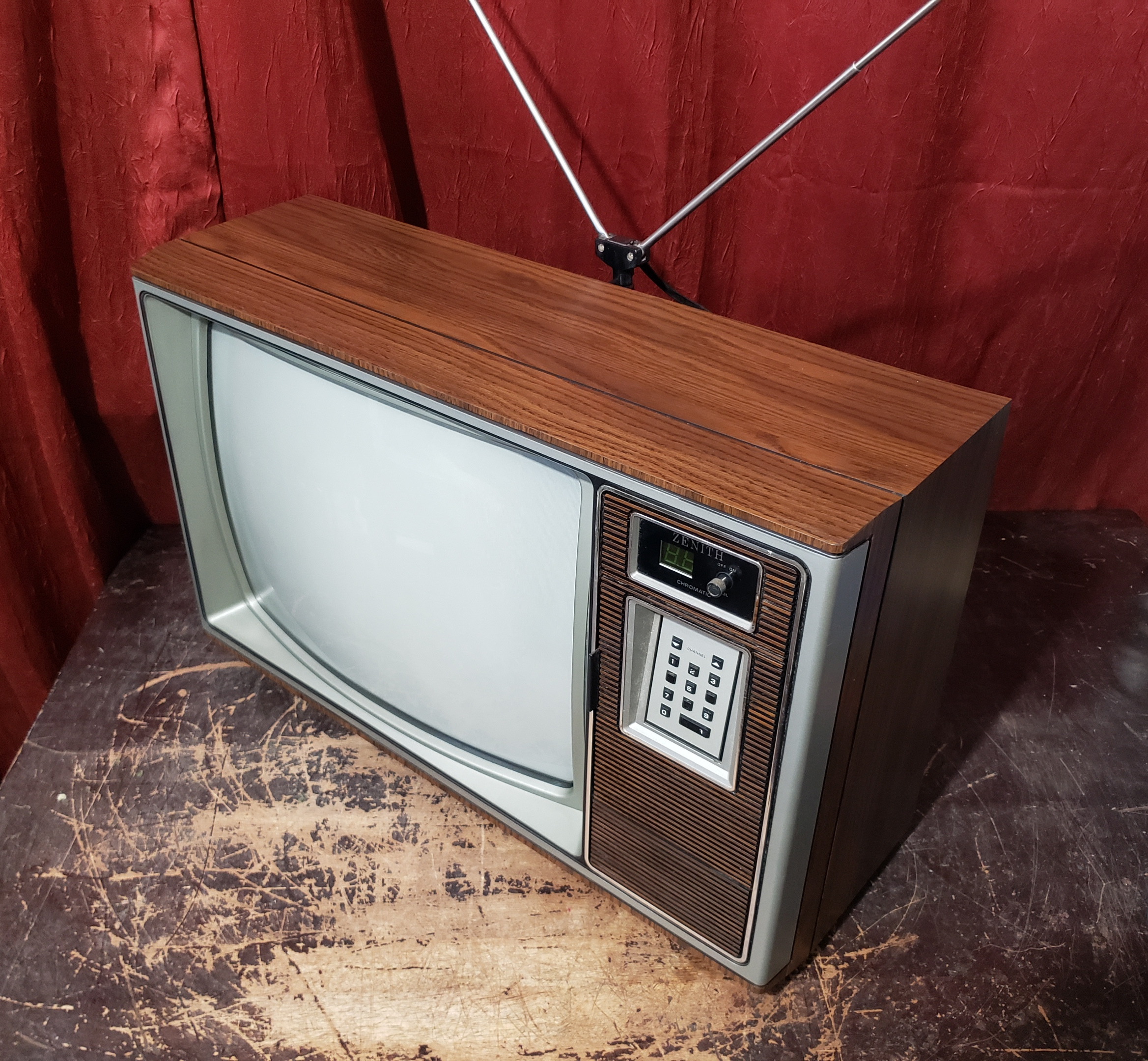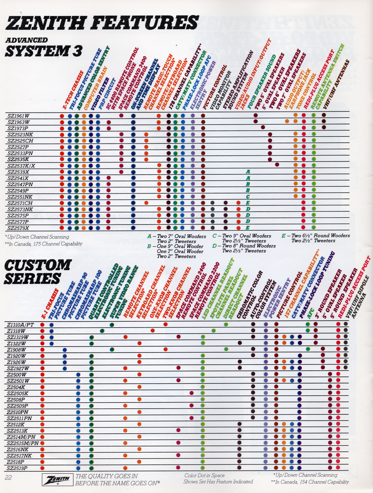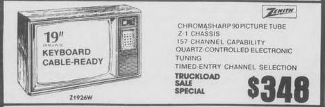 Decorator-compact Styling! Simulated grained Spartan Walnut finish with bright Aluminum color trim. Zenith ChromaSharp 90 Picture Tube for superb picture sharpness and highlight detail. Dependable 100% Modular Z-1 Chassis for ling-life reliability. Electronic Power Sentry protects chassis, controls energy usage.